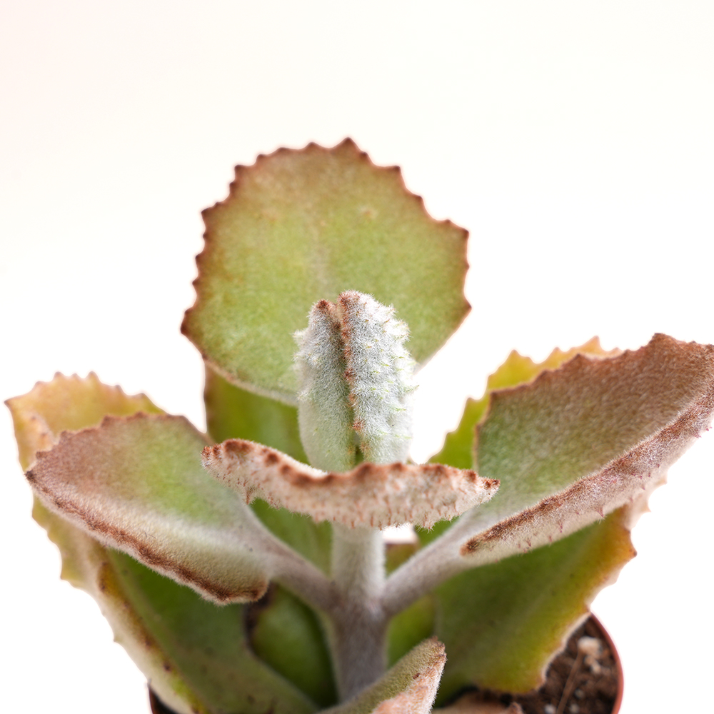 protuberanze simili a stalattiti che pendono dalle foglie più mature. Foglie che sono verdi-grigie di forma leggermente triangolare, lunghe fino a 10 cm, dotate di tanti piccoli peletti. Cresce lentamente e raggiunge delle dimensioni più modeste rispetto alla