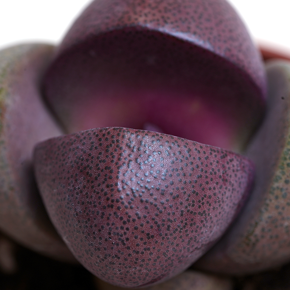 La caratteristica più distintiva del Pleiospilos nelii “Royal Flush” è la sua forma a rosetta compatta e le sue foglie carnose, che crescono a coppie sfilzando di 90° e conferendo alla pianta adulta una geometria particolare che cattura lo sguardo. Queste foglie sono di un rosso intenso, con puntini neri o rosso scuro, creando un effetto visivo sorprendente e affascinante.