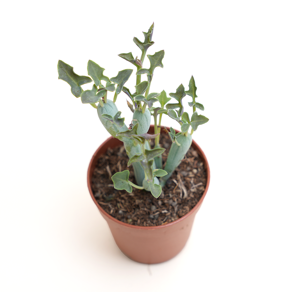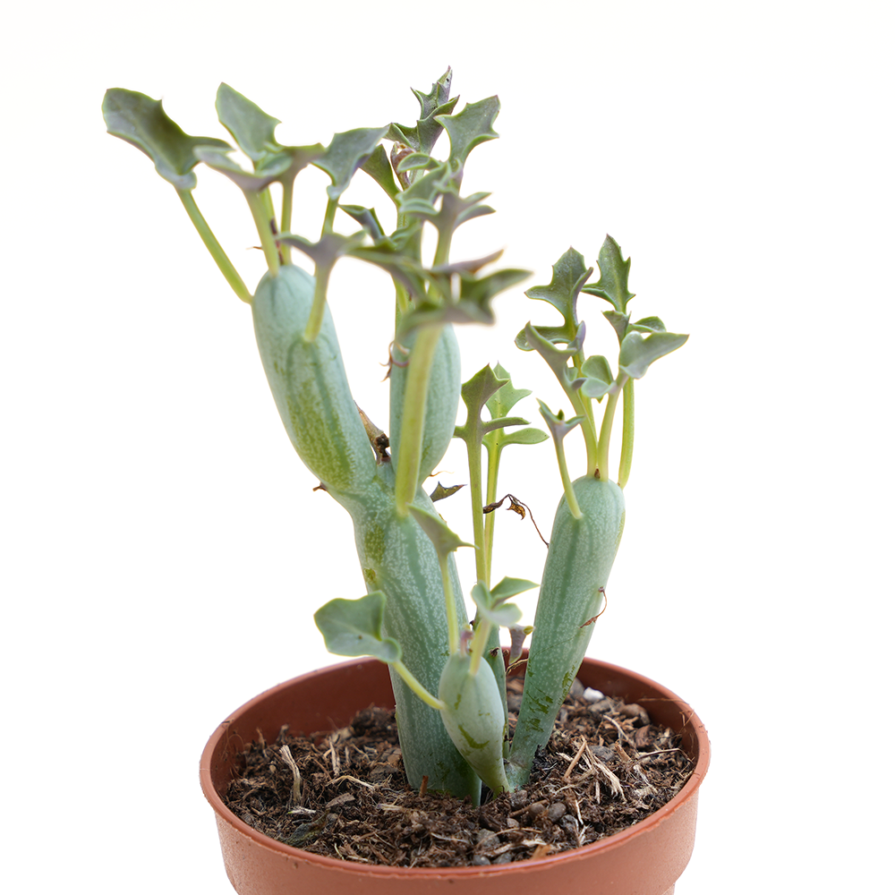 Sudafrica, presenta un aspetto distintivo e molto apprezzato, caratterizzato da fusti cilindrici e segmentati che possono raggiungere una lunghezza di circa 30 cm per segmento. Le sue foglie, di un tenue verde bluastro, sono piccole e sparse lungo i fusti, conferendo alla pianta un aspetto interessante e ornamentale. Durante la fioritura, il Senecio articulatus produce infiorescenze a forma di ombrello di colore bianco o crema, piccoli ma graziosi. È una pianta resistente e facile da coltivare, ideale per giardini