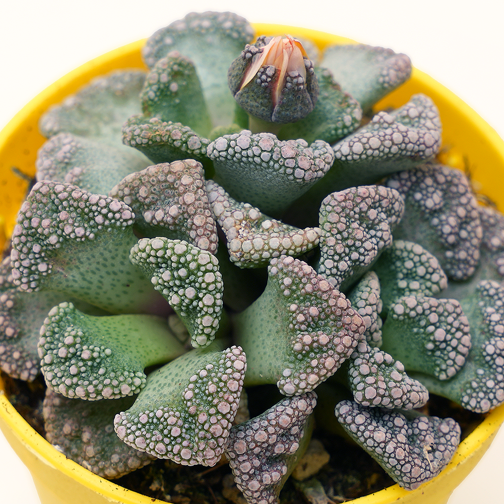 Titanopsis calcarea regala uno spettacolo straordinario con fiori gialli dai petali delicati, che sbocciano tra le foglie in modo quasi surreale. Questo contrasto tra la sua forma rocciosa e i fiori vivaci la rende una pianta davvero unica nel suo genere.
